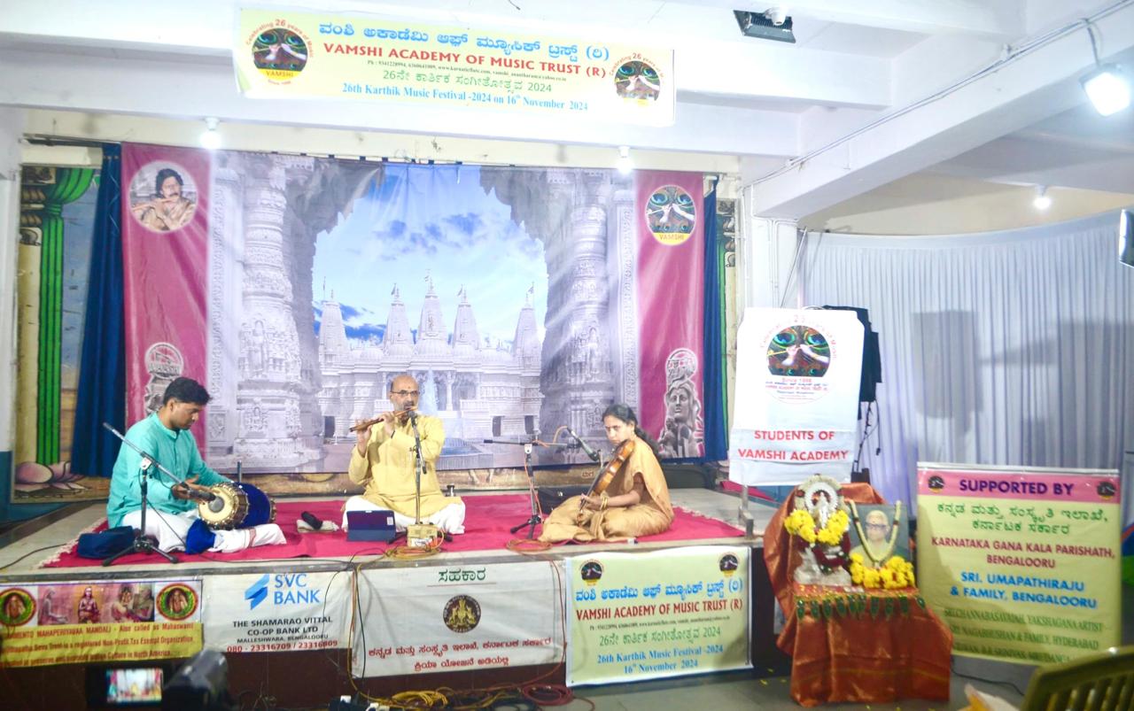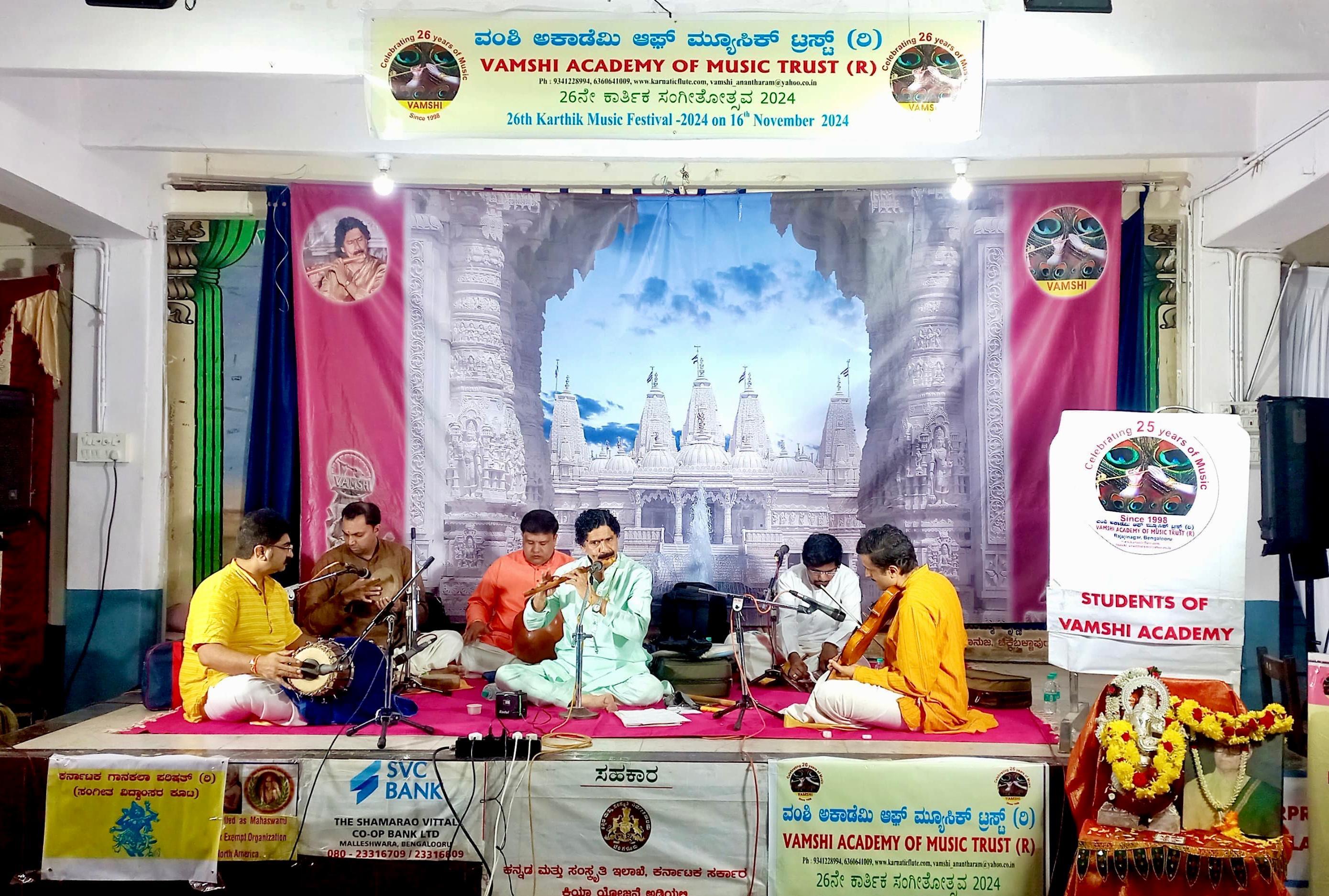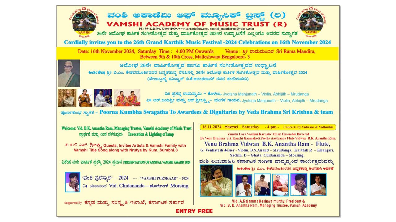 Vamshi 1st Anniversary - 1999 1st Year Inauguration of Vamshi AcademySri B.K.Anantharam with his Gurus Vamshi 2nd and 3rd Anniversary - 2001 Second year InaugurationThird year InaugurationAnanth Ram Sir concertARAM sir with SRI.NITTOOR SRINIVASA RAO Vamshi 4th Anniversary - 2002 InaugrationFlute performance by Sashidar Sir Vamshi 5th Anniversary - 2003 Vamshi 6th Anniversary - 2004 Vamshi 7th Anniversary - 2005 Vamshi 8th Anniversary - 2006 Vamshi 9th Anniversary - 2007 Vamshi 10th Anniversary - 2008 Vamshi 11th Anniversary - 2009 Vamshi 12th Anniversary - 2010 Vamshi 13th Anniversary - 2011 Vamshi 14th Anniversary - 2012 Vamshi 15th Anniversary - 2013 Vamshi 16th Anniversary - 2014 Vamshi 17th Anniversary - 2015 Vamshi 18th Anniversary - 2016 Vamshi 20th and 21st Anniversary - 2019 Vamshi 22nd Anniversary - 2020 Vamshi 23rd Anniversary - 2021 Vamshi 25th Anniversary - 2023 Vamshi 26th Anniversary - 2024 Vamshi Puraskara to Vid. Chidananda - Morsing Vamshi Puraskara Award to Vid. ChidanandaFlute performance by Venu Brahma Vid. B.K. Anantha RamInaguration of 26th Vamshi Karthik Music Festival Report on 26th Karthik Music Festival - English Report on 26th Karthik Music Festival - Kannada Move To Top